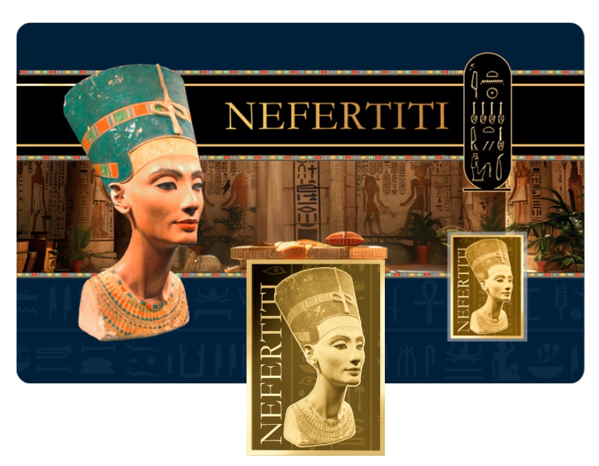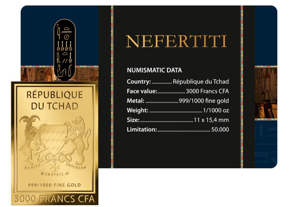 Moneda de 3000 francs CFA de la República del Tchad.Oro 999/1000. 1/1000 onzas AU. Peso: 0,031 gr AU. La moneda se entrega en coincard. Medida coincard 85×54 mm. Nefertiti.
