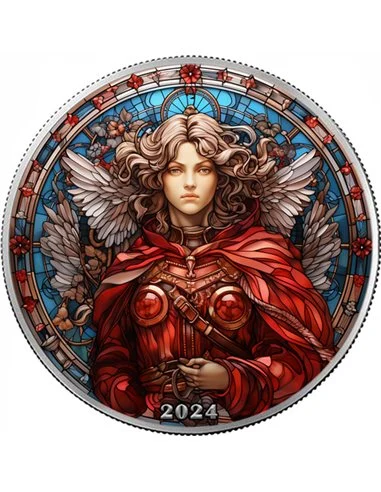 Esta hermosa moneda es la primera emisión de la serie “Vidrieras Sagradas”, dedicada a un arte hermoso y antiguo que ha escrito mil años de historia artística, las vidrieras. En esta serie, este arte milenario se fusiona perfectamente con la religión. La moneda representa a uno de los santos más importantes: el Arcángel San Miguel .