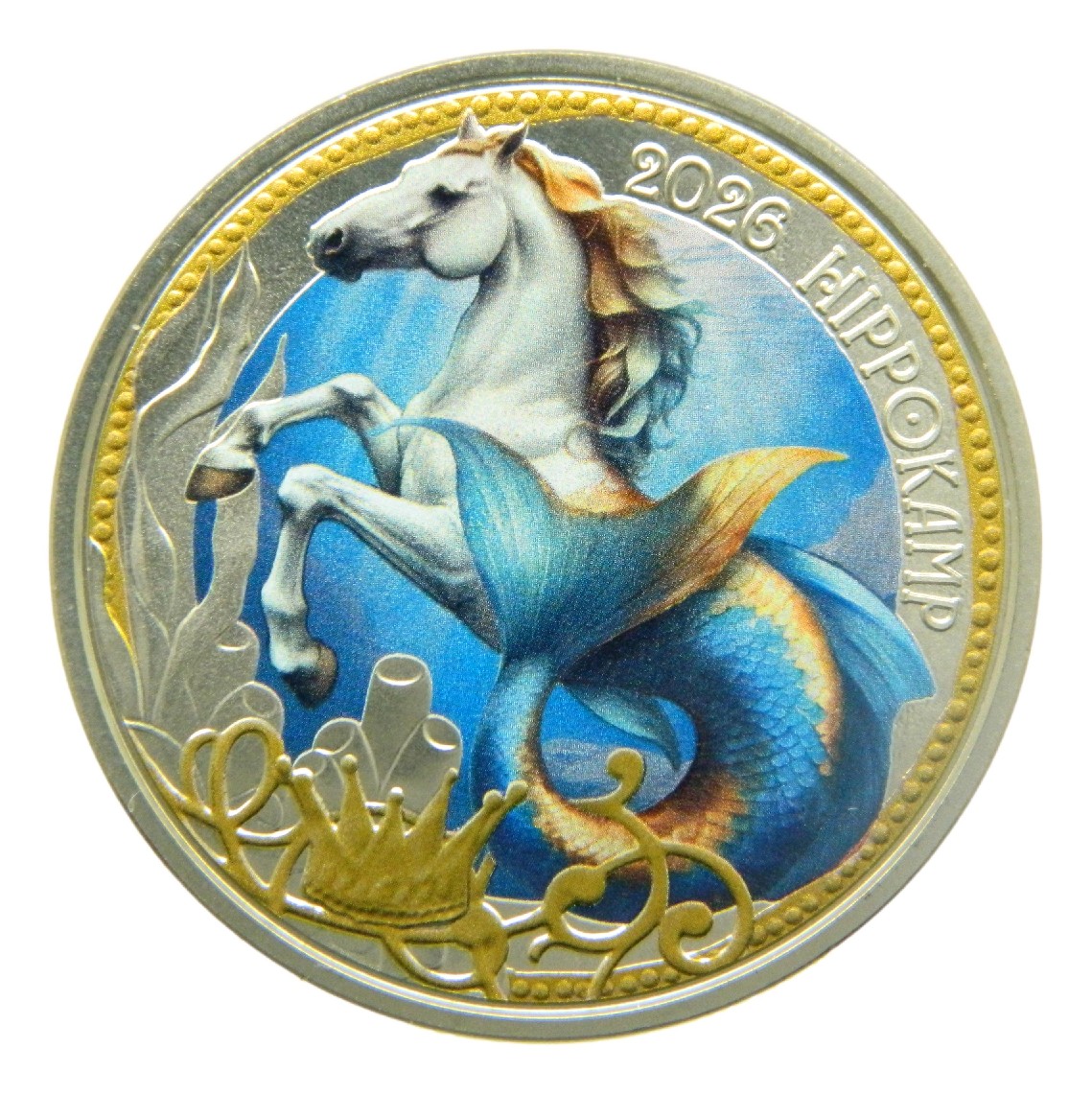 Segunda moneda de la colección de Criaturas míticas – Hipocampo – caballo marino guardián de los océanos legendarios. La colección se compone de 12 monedas dedicadas a seres míticos de todo el mundo. Monedas coloreadas que al usar la linterna con la luz ultravioleta aparecen colores con brillo intenso y fluorescente. Monedas dedicadas a trols, unicornios, dragones, sirenas, fénix, basiliscos, hombres lobo, centauros, grifos, hipocampos y serpientes marinas. Diámetro 34 mm. La moneda se entrega suelta.